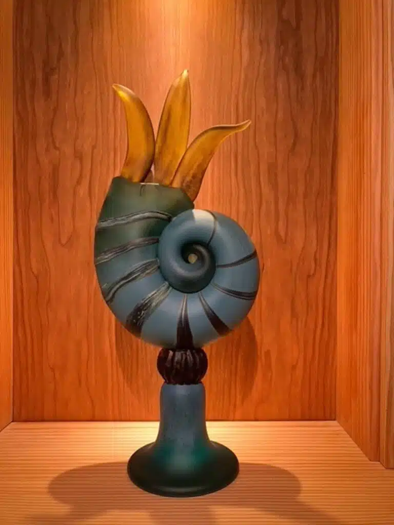 Kelly O’Dell was born in Seattle in 1973, raised in Hawai’i, and now lives in the Pacific Northwest. When she was very young, her artistic parents made their living using stained glass, furnace glass, and pressed flowers. While seeking her college education years later, Kelly discovered glass as her primary focus at the University of Hawai’i. The program offered her many opportunities to study at Pilchuck Glass School, and she eventually relocated there as a member of the William Morris Winter Crew. Her work mainly explores themes of extinction, preservation, and human impact on the natural world. She resides in Stanwood, WA with her husband Raven Skyriver and their 7 year-old son Wren.